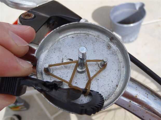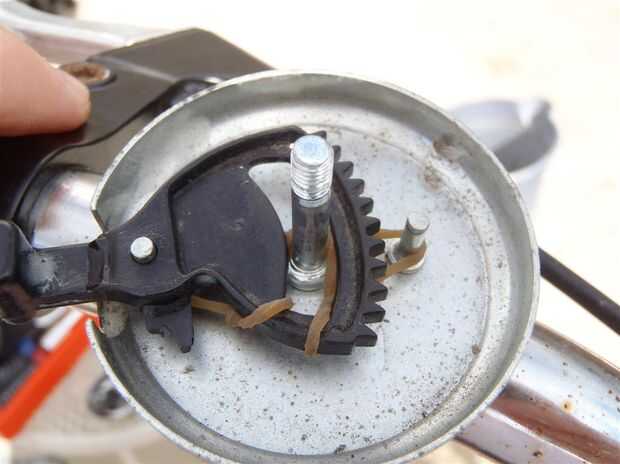 Esta parte puede ser un poco diferente, dependiendo de lo grande de una banda de corredor está utilizando. Esencialmente, queremos un montón de tensión en la goma cuando el impulsor es presionado. Para crear esta tensión, estirar la banda elástica alrededor de las clavijas de engranaje en la campana. Para aún más tensión, tiré de la parte del lazo del nudo sí mismo alrededor del poste de centro así.