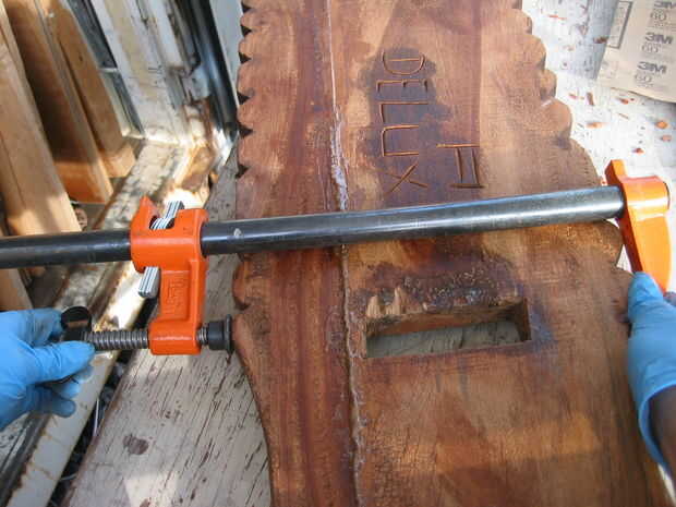 Desea ver cola exprimir de la Unión. Eso se llama "buena squeezout" en el comercio. Estoy usando las abrazaderas de la barra porque los tengo. Si no tiene pinzas utilizan innertubes, palillos, cuñas o pesos hacerlo.