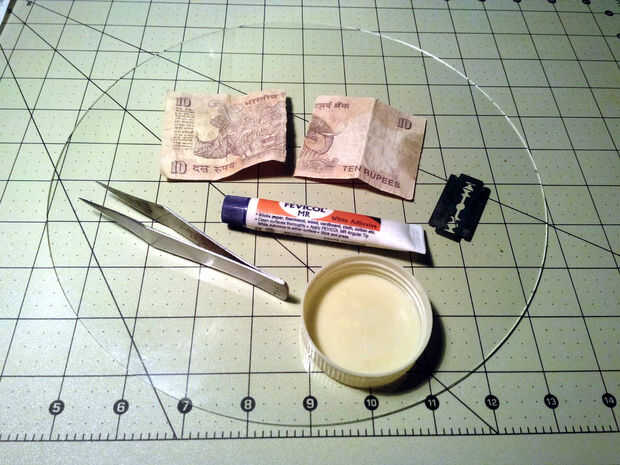 Otros artículos que usted necesita están una superficie de trabajo de cristal, una cuchilla para raspar el vidrio y un recipiente para mezclar el pegamento.