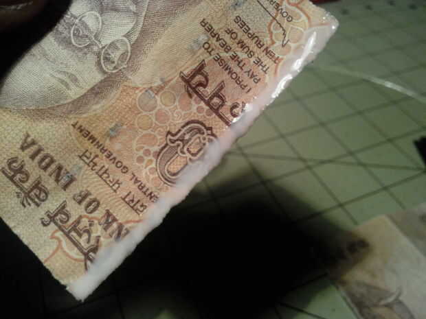 Para aplicar el pegamento tomé sobre una gota del mismo en la punta de mi dedo y aplicar en un extremo de la nota rota. Recuerde que el pegamento se vuelve casi transparente cuando se seca.