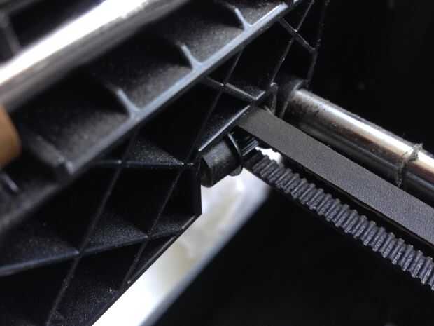 El diseño de este apesta. Hay un eje de metal frotamiento contra una ranura de plástico. Eventualmente se desgastará y hacer que la correa aflojar. Siguiendo el procedimiento estándar para apretar el cinturón sólo arreglará para un cortocircuito mientras que. Este problema ha empeorando progresivamente y finalmente llegó a un punto donde la correa siempre fue saltar dientes durante cada paso hacia adelante y hacia atrás. Parece que han arreglado y me alegro compartir como lo hice.