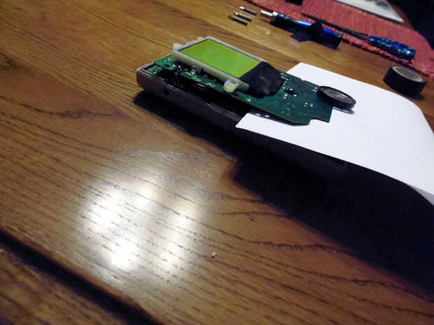 La imagen es una lateral para mostrar el trabajo de la cinta. No tiene que ser bonita, pero todas esas capas de cinta serán A.) mantener la etiqueta en su lugar y B.) aumentar el espesor para que el caso externo de la Game Boy tiene la etiqueta en su lugar.