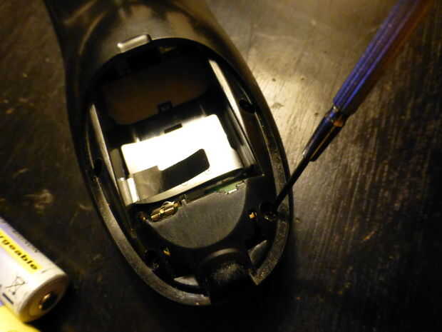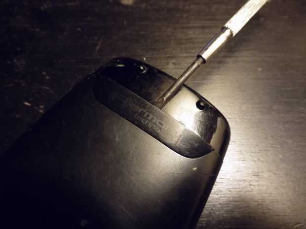Hay 6 tornillos y 6 clips que sostienen las dos mitades del mando a distancia juntos. 4 tornillos en el compartimento y 2 bajo una cubierta adhesiva cerca del final que transmite. Quitar los 6 tornillos y ponga en un lugar seguro (que son pequeños!).