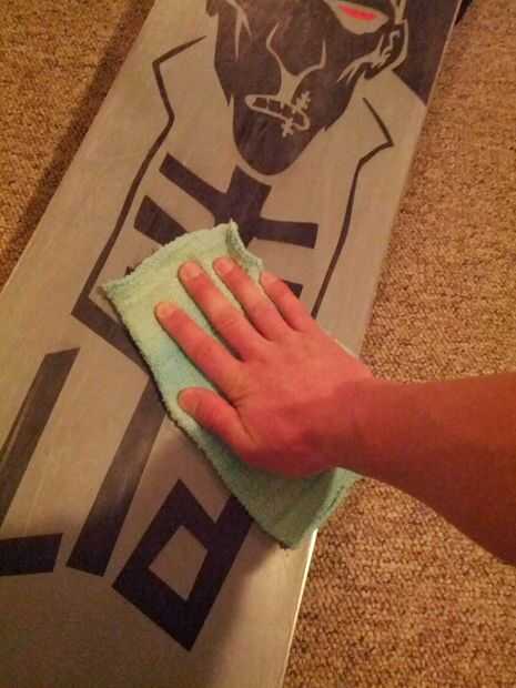 2. ahora es necesario quitar todas las partículas de cera y la suciedad desde el fondo de la tabla. Aplique el citrus limpiador liberalmente a la parte inferior de la tabla. (ver fotos 2 y 3 de este paso)