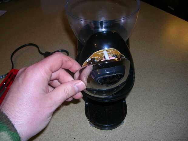 Los cinco botones (4,8,10,12 Copa y cierre) se encuentran en una sola pieza de plástico cromado en la parte frontal del molinillo. Con la uña, un destornillador muy pequeño u otro instrumento, insértelo en la parte superior de la costura entre la pieza de cromo y el plástico negro. Haga palanca suavemente, y el panel de control todo probablemente saltará fácilmente. Se une con unas pocas pulgadas de alambre aislado, así que no cae enteramente, y no hay razón para preocuparse de perder alguna pieza.