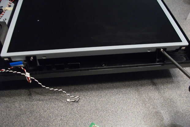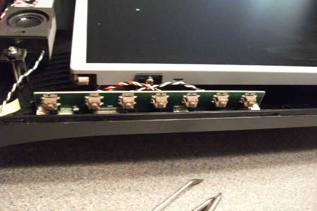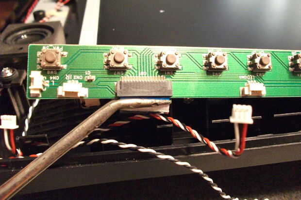 En el lado derecho, hay una pequeña placa de circuito con todos los botones de control en él. Levante suavemente y retire con cuidado los cuatro cables y el cable de cinta de él. Dos de los cuatro cables van a los altavoces, uno va al sensor remoto IR y uno va al LED de alimentación. Estos están marcados en la placa de circuito. Sólo recuerde reconectarlos en los lugares correctos cuando se pone todo volver juntos.