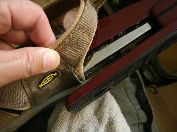 2. Utilice la grapadora de tal manera que la parte plana de la grapa se enfrenta a su pie y lo agarre de la grapa es hacia el exterior de la zapatilla.