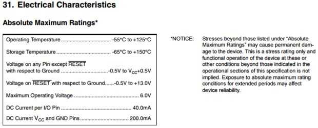 Por ejemplo, el procesador ATmega en su tabla es muy sensible a la tensión que recibe. Si está expuesto a más de 6v soplará para arriba - literalmente. Echa un vistazo a la hoja de datos (se adjunta, también os he adjunto una captura de pantalla de resumen) para que pueda ver los diferentes "grados máximos absolutos". Máximo absoluto significa sólo que esto es qué más hojas de datos definen como: