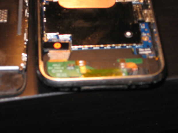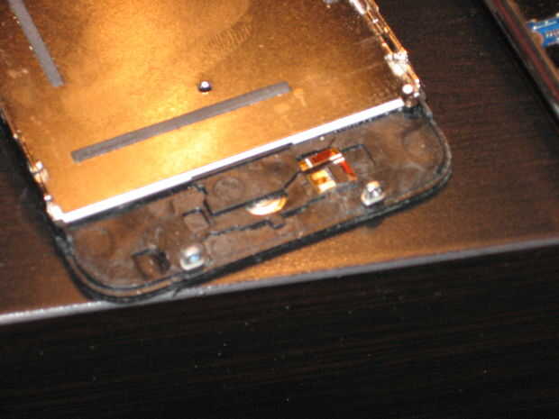 Ahora si nos fijamos en la parte inferior del teléfono, verá dos las almohadillas de contacto para que tocan esos resortes, tome nota de la orientación. Usted tendrá que soldar los contactos correctos. Lo siento por la foto borrosa, parecía buena en mi cámara...