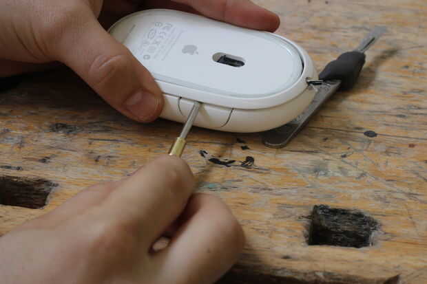 Cuña cuidadosamente su destornillador entre el anillo de montaje y el botón del ratón. Por favor tenga cuidado aquí, de lo contrario podría dañar el ratón. No lo fuerce. Su forma de trabajo alrededor el ratón lentamente y constantemente, con el bisturí para levantar para arriba el anillo un poco antes de ir con el destornillador. En ratones viejos, los ganchos poco podrían ser más propensos a romperse. Si se rompen, no se preocupe. Tendrá algunos sugru sobra para arreglarlos.
