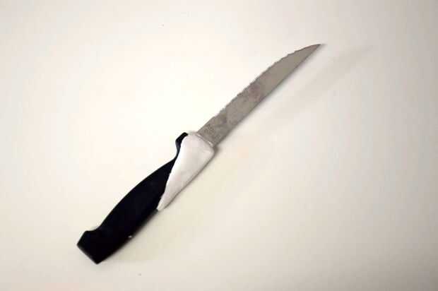 un grito de pánico vino de la cocina y afortunadamente no hubo ningún derramamiento de sangre. Un cuchillo de cocina había deslizado y caído en el piso de azulejo.Roto en dos esto sería ya sea basura, un cortador de caja manejado agradable o un nuevo