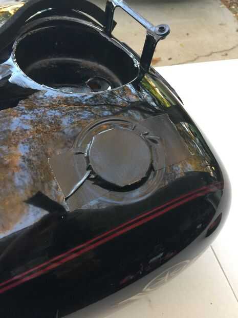 Usé cinta gorila para sellar las aberturas. Comience con el agujero de la llave de purga. Seco y la llave de purga para ser sellada para que se pegue a la cinta. Una capa con 1" traslape hizo el truco para mí. Realmente frotar alrededor de las aberturas para sellar bien. El orificio de la válvula era más fácil, ya que gran parte de la superficie es plana cerca de la abertura. Asegúrese de cubrir los orificios de la llave de purga también puesto que penetran el tanque y puede ser un punto de fuga. Vierta la Marina limpia y agua caliente por las indicaciones en el orificio de la tapa de gas (supongo que estás fuera de estos pasos de chapotear). Luego seca el área alrededor del agujero del tapón de gas y aplicar el sello de cinta. Mostré cómo apliqué la cinta en mi orificio de la tapa de gas en la imagen. Realmente Presione la cinta en el borde para sellar. Si se filtra un poco no te preocupes solo Limpie la superficie pintada. usted conseguirá una oportunidad más de práctica antes de que el tanque importante sello paso donde él realmente necesita ser sellada. Estos primeros pasos también comenzará a darle una sensación de cómo se construye la cavidad del depósito. Se necesita ser un experto en "sentimiento" donde está el líquido en el tanque... donde las cavidades están cómo se chapotea de una cavidad grande (a la izquierda) a la otra cavidad grande (a la derecha). En este punto y ver la película caddie Shack si usted no lo ha visto todavía (es un clásico). La escena de importancia es cuando Ty Webb (Chevy Chase) es decir Danny Noonan (Michael o ' Keefe) que "la bola de Danny". Necesita que "el líquido". La materia va a ser agitó alrededor con ninguna forma de determinar si hizo un buen trabajo. Todo lo que puede ver es como 1% del interior superficie. Agítelo vigorosamente para una duración que se describe en las instrucciones. Mis brazos duelen después de esto se hizo.