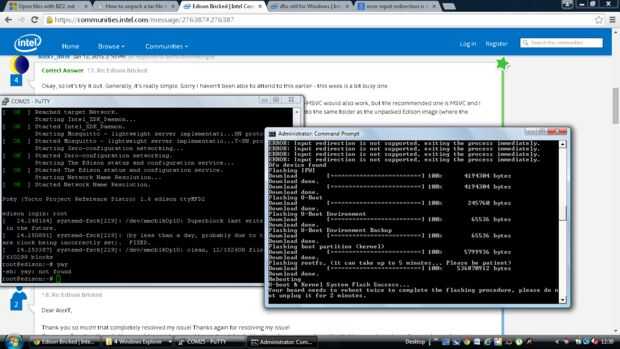 - Tan pronto como abres "flashall.bat", conectar a tu Edison con ambos cables. El proceso de flasheo debe comenzar en unos instantes.