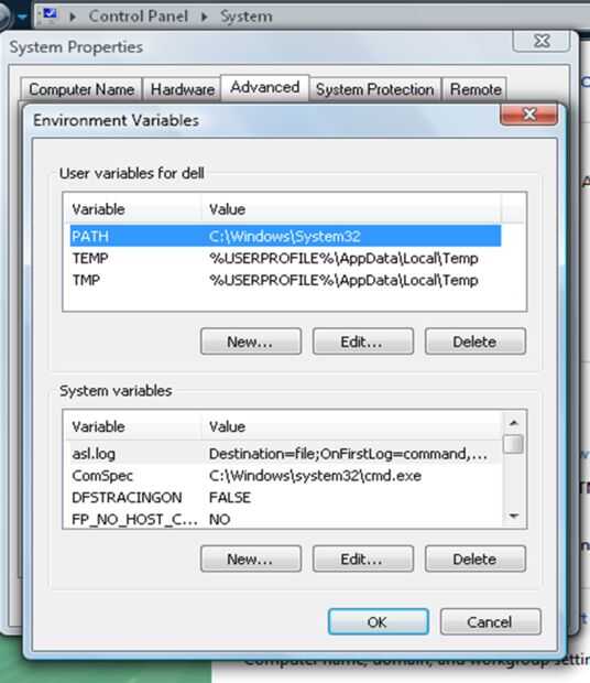 - Ir a Panel de Control < sistema < configuración de sistema avanzada < variables de entorno. Compruebe el valor de "camino". Debe ser "C:\Windows\System32". Si no es así, haga clic en el botón Editar y escriba el nombre correcto...