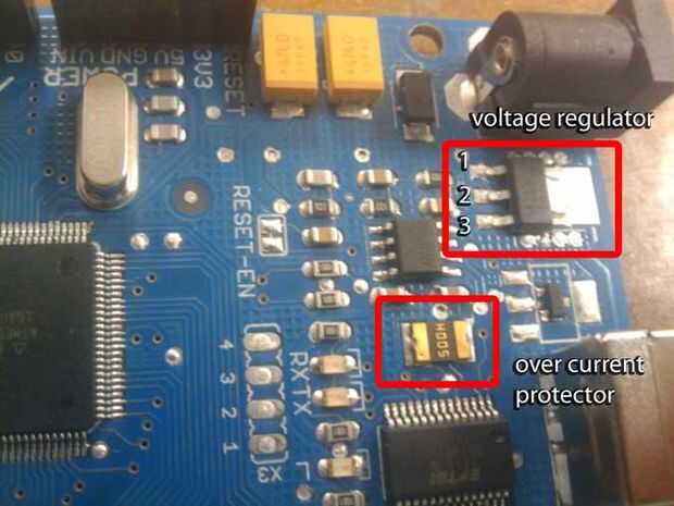 Después de pensar lo que podría posible equivocarse, el regulador de tensión vino a la mente. Toma cualquier tensiones entra en la fuente de alimentación y trae abajo a 5 voltios que se necesita para el chip ATmega. El regulador en el tablero es la: MC33269D-5.0