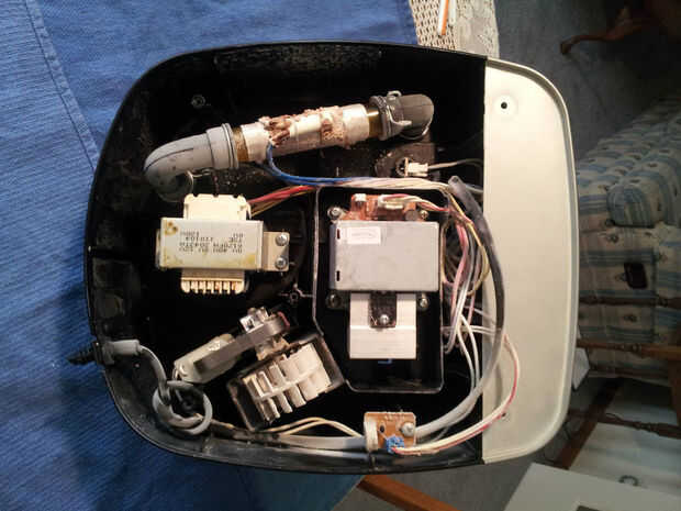 - El tubo de vidrio de agua, alrededor del cual está envuelto el elemento calefactor, se agrietó. Esto permitió que agua y minerales en el agua crearon una acumulación alrededor del tubo y el elemento de calefacción. La resistencia parece quedar dañado irremediablemente.