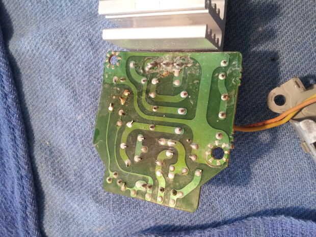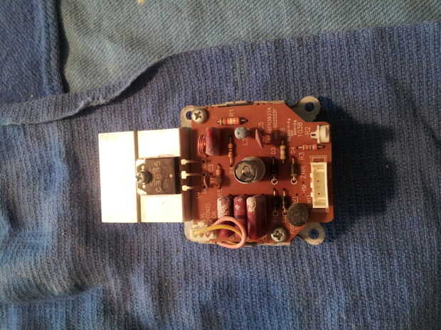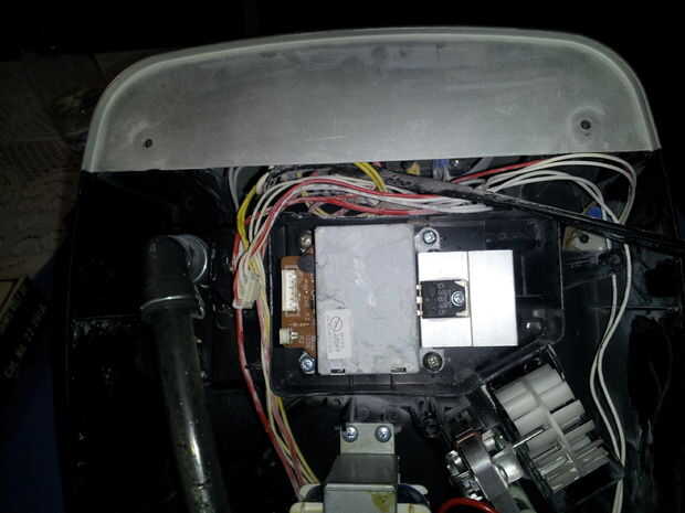 Tenga en cuenta la magnitud de los daños a la unidad. La tercera imagen muestra cómo agua de alguna manera se filtró sobre el tablero de circuito, probablemente un cortocircuito de las conexiones y que sopla un fusible. Parece que los depósitos minerales en el tablero. La segunda imagen muestra cómo algunos de los yacimientos minerales han acabado en algunos de los condensadores.