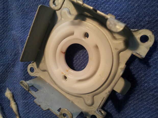 Quitando el vibrador real (se ve como un pequeño Altavoz), usted puede encontrar grietas en el sello que mantiene el agua fuera de la unidad. Estas grietas permiten agua dentro de la unidad. Esta agua cae directamente en el circuito a continuación, es probable que se ponga en cortocircuito algunas conexiones y haciendo que el fusible. Una vez los flujos de fusible, la unidad del vibrador no funciona, por lo que el agua no puede ser convertido en niebla, pero la electrónica restante continuará en función (por ejemplo, el indicador).