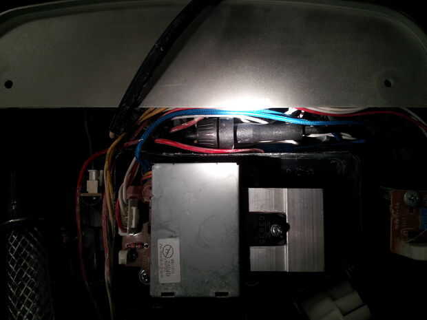 Al volver a montar, encontrar un lugar para meter el portafusible de y asegurar que los cables no se cogen en el ventilador de enfriamiento y no aplastada o prensado cuando vuelva a instalar la cubierta. En la tercera foto muestra el aparato vibrador ultrasónico vuelve a montar y a instalar, junto con el soporte de fusibles. No te olvides de poner un fusible en el portafusibles!