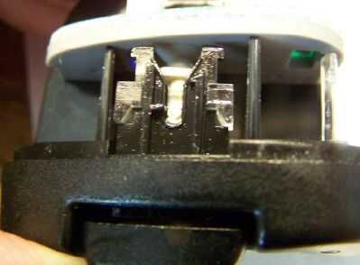 Observe la pequeña pata de tres brazos en primer plano. Es lo que mantiene este interruptor en la posición "on". Observe el centro del blanco. Es realmente claro y es un eje que se ha roto en el bloque de plástico transparente que rodea la pieza en forma de "T" blanco en el centro de la Asamblea de interruptor. Ver los cuadros de texto amarillo. Este árbol pequeño es un poco menos de 1mm de diámetro. Plástico tiende a ser frágil con la edad, y es sólo 1mm de diámetro desde el principio. Estos interruptores no se que árbol poco roto es la razón.