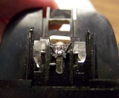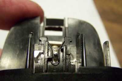 Foto cuarta--la cuarta foto muestra instalada en el nuevo eje de la pata de tres brazos. Tenga en cuenta la orientación de los extremos con muescas de los brazos de la pata. La pata funciona sólo de una manera. Afortunadamente, usted puede probar para ver si la pata rota como se activa el interruptor. Si la pata no gira, quitarlo, dan la vuelta y lo pones de nuevo en el eje. Deslice la tapa de montaje del interruptor y vuelva en su lugar. Hay una superficie plana dentro de la cubierta de montaje que mantiene la pata tres brazo sobre su eje. La longitud del eje debe ser lo suficientemente largos, pero no demasiado. No debe raspar en el área plana que mantiene las garras en el árbol.