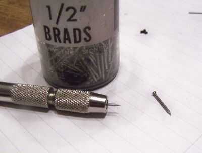 Segunda foto, utilicé un brad de alambre montada en un mandril de aficionados para brocas muy pequeñas. Tuve que quitar la cabeza del brad de alambre para encajar en el mandril de aficionados. Usé la punta como la broca para hacer el corte para el agujero. Pues yo utilizaba la parte trasera con un extremo afilado más embotado (como resultado de cortar el brad de alambre con un alicate de corte lateral) hasta la Plaza del agujero.