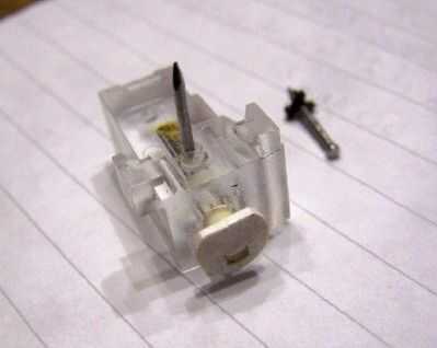 Tercera foto, corte el brad su aproximada longitud acabado y pegado en el agujero con pegamento epoxi. (El brad aparece aquí antes de que se corte y tierra o presentó ante tamaño.) Debe haber ningunas rebabas en el extremo del eje. Cuando todo está listo, introduzca el bloque de plástico transparente en el conjunto del interruptor.