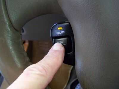 La foto muestra el interruptor de encendido/apagado con el botón presionado. Observe que un LED indica cuando el regulador está "encendido". Ver el cuadro de texto amarillo. Describe la grieta entre el interruptor y el cuerpo alrededor del interruptor. Esto es donde algunas personas acuñan una moneda o un pedazo doblado de papel para sostener el botón del interruptor en el "in" o "en la posición on". Aunque esto funciona, es una distracción incómoda e insegura cuando se conduce en el tráfico a velocidades de autopista. Sin embargo, todavía funcionan las otras funciones normales del Control de crucero. Por lo tanto, las funciones de cancelar, conjunto y currículum podrían utilizarse para operar el Control de crucero mientras se conduce realmente.
