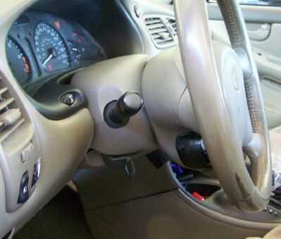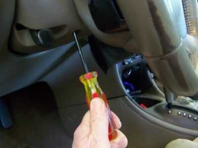 Ver la tercera foto. Se ha eliminado la mitad superior de la chimenea de la columna. Hay dos tornillos TORX T-27 ahuecados en el lado de la rueda de manejo del conductor (hacia la parte delantera del coche). Espacio de acceso es limitada. El espacio entre el volante y el panel de instrumentos es demasiado corto para permitir que un destornillador T-27. Os adjunto un poco TORX para una unidad de toma de 1/4 de pulgada y una extensión corta. Sin embargo, también tenía que girar el volante para que cada agujero de tornillo quede más ventajosamente. Coloqué a un gato de piso hidráulico, en el marco del coche en el frente y lo suficiente para hacer girar la rueda de manejo mucho más fácil levantado. Gire el volante hasta que el agujero esté sobre la posición de 11:00 para un tornillo y en sobre la posición de la 1:00 para el otro.