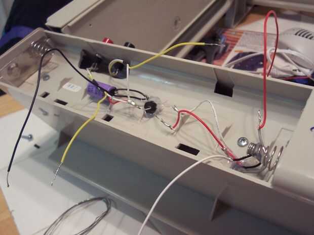 El cable del motor de la pantalla es de un retractor de cable. He añadido el cable a los extremos y funcionó en el compartimiento de batería. También he añadido un cable desde el suelo. Pegamento caliente se utiliza para contener todo.