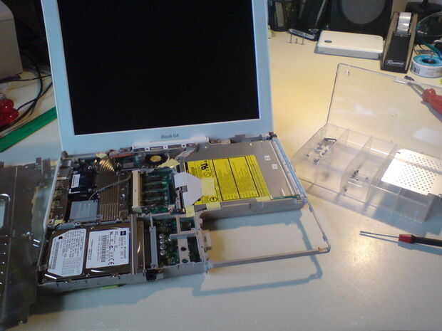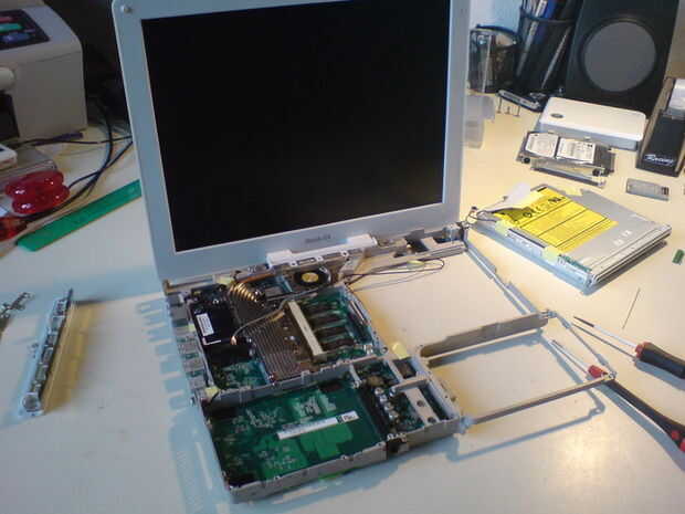 Ahora eliminar cada tarjeta de extensión que puede encontrar - de RAM, módem, aeropuerto (quitar la antena de los cables y mantener el orden en la mente para más adelante). Retire también cada conexión de cable con cuidado - no romper las tomas a veces bastante pequeñas.