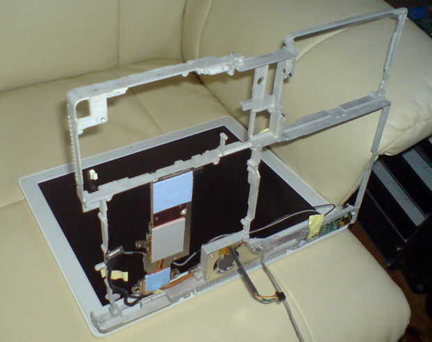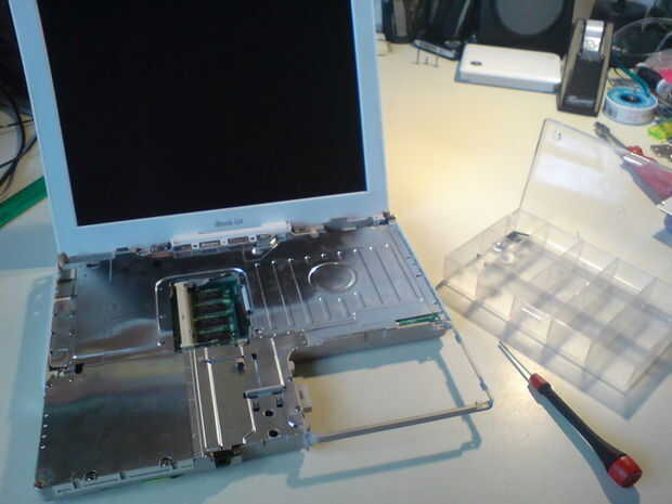 Por ahora debería ser capaz de eliminar completamente la Junta (la mejor manera es mi humilde opinión el cuaderno en la parte posterior de la pantalla - 90 abierto - y mueva cuidadosamente el tablero hacia fuera. Luego tienes tu notebook-canal separado como en la figura 4.