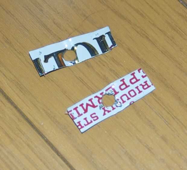El combo del perno/de la manga era bueno para ir, así que mi única preparación implicó cortar una lata altoids y perforar los agujeros en las cosas. Mi plan original era para pegarse un pedazo de lata altoids en el exterior de la maleta y uno en el interior de la abrazadera de plástico. La ranura para la tira de goma era de 1 cm de ancho y el soporte era 3 cm de ancho así que corte dos pedazos de altoid tapa 1 cm x 3 cm. Agarré el lado de la manga de la Asamblea del perno/de la manga y determinó que encajan más en un agujero de 3/16", agarró un drillbit apropiado y perforar agujeros a través del centro de las dos piezas de tapa de altoid. Luego me fui un perforado un agujero en la maleta al lado del viejo remache. Colocó cerca suficientemente que el soporte de plástico cubre el viejo remache.