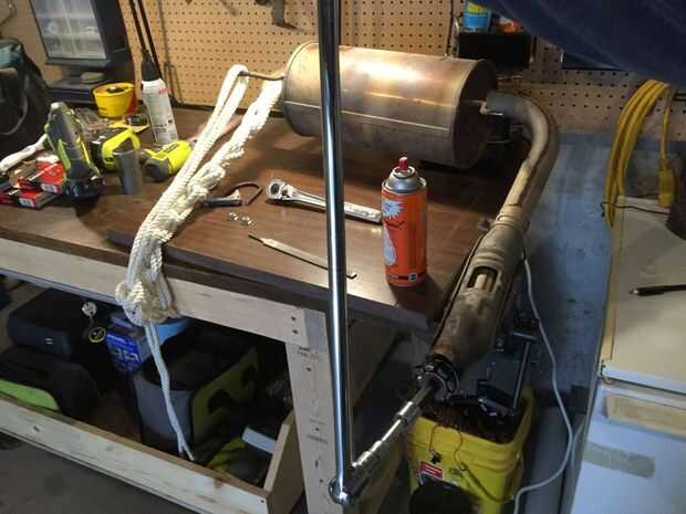 La cuerda vino en práctica como una improvisado mano 3 para mantener el silenciador a la banca mientras que retornando en él con una barra del triturador. La sección de la tubería media se colocó en las fauces de mi mordaza y la cadena de la cuerda se coloca alrededor de la parte superior de la tabla a continuación a través de la bahía que lo cuelgo con el exceso que se coloca sobre un soporte de silenciador que no necesito fijar rápido, pero lo necesito para no moverse tanto.