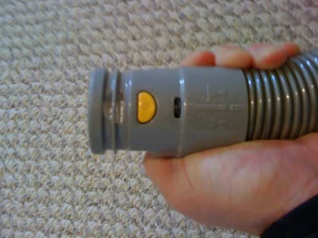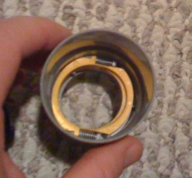 Tener mucho cuidado con el extremo de negocio plástico gris. Hay dos pequeños manantiales que se utilizan para poner la tensión en el botón amarillo. Con la manguera separada, estos resortes se pierden y pueden salir fácilmente si usted no tiene cuidado. Es fáciles volver a poner en su lugar si salen, pero son pequeños y fácilmente se perderán si no mantiene una estrecha vigilancia sobre ellos.
