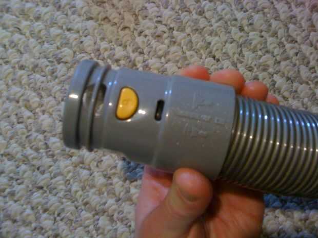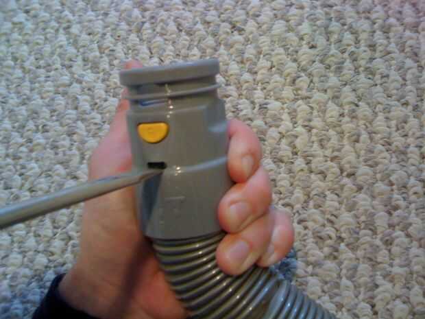 Ahora, empezar por soltar las dos pestañas negras en cada lado para soltar el tubo. Sostenga el extremo de la manguera con el botón de bloqueo en la parte superior y apriete los lados para aliviar la presión sobre las dos pestañas de negro. Utilizando el destornillador, empujar duro en la primera pestaña negra, luego gire el mango del destornillador hacia el extremo abierto de la manguera, apalancando la ficha fuera del agujero, hasta que haga clic. Gire el extremo de la manguera y repita para el otro lado. Cuando hace clic en la ficha 2 hacia fuera, la manguera liberará fácilmente desde el extremo de la manguera.
