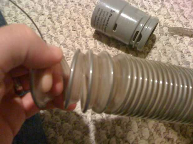 Usando una combinación de tenazas y la fuerza bruta, retire la pieza de plástico negro desde el extremo de la manguera. Quedará con algo que se ve así.