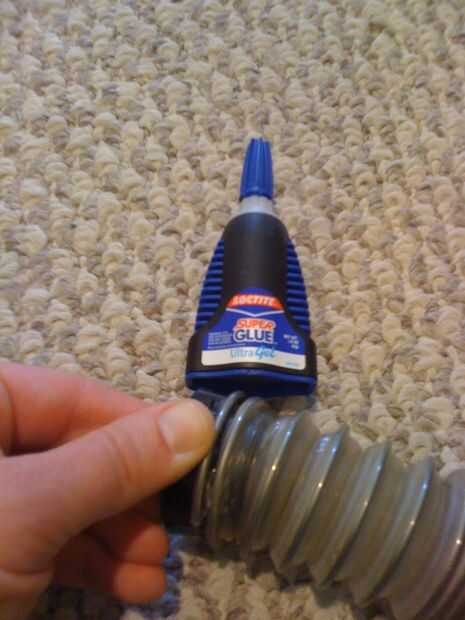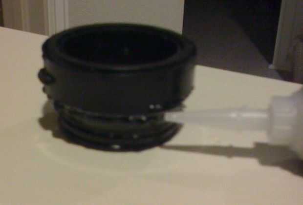 Todo bien, coloque una buena cantidad de pegamento alrededor de los bordes de la pieza de plástico negro donde hará contacto con la manguera. Si utilizas demasiado, como yo lo hice, terminarás con algo en las manos. Si usa muy poco, no tendrás un asimiento fuerte. Prefiero pecar de demasiado, pero tenga cuidado de mantener el pegamento de los dedos.