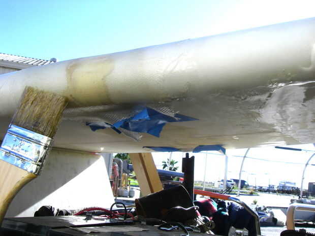 Yo monté la disposición de desechos impares ya que es una cubierta y se supone que es áspera. Mi mayor pieza de 4 oz fue en la parte superior. Los bordes expuestos de paño de pie y hacen cantos cuando impregnado con la resina. Así que poner tus pequeños pedazos debajo de las piezas más grandes así que usted consigue solamente un borde irregulares.