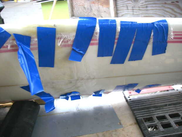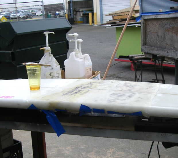 a la junta grande. Una capa de 8 oz de vidrio y una capa de 4 oz sobre eso. Esperar 10 minutos para que la resina a reaccionar después de mezclar para arriba. Comienza apenas calienta para arriba antes de pinto en el tablero, poner la tela, cinta adhesiva alrededor de los rieles y saturarla. En un día caluroso que no espero, mezclar pintura en y Date prisa, porque es probable que "kick off" en la Copa, conseguir realmente caliente, humo, son duros en un bulto grande y derretir la taza en.