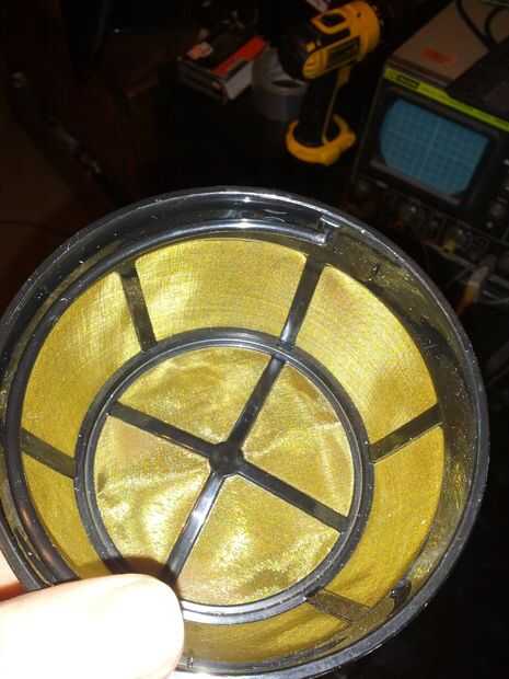 Mi solución es para cubrir los agujeros desde el interior con una gran pantalla con una malla muy fina: un filtro de café "oro" (no son realmente de oro, como veremos). Quieres algo bueno y valiente, que a pie hasta un poco de abuso.