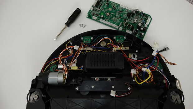 Después de la apertura bObsweep, ves el tablero principal en el centro. Para quitarla, necesita desconectar 11 circuito más enchufes y desinstalar 3 tornillos.