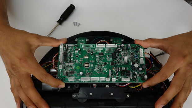 Vuelva a colocar la placa principal en bObsweep. Asegúrese de que alinean los agujeros en el tablero principal con los postes del tornillo en Bob.