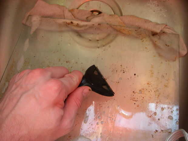 Tengo un raspador de ventanas - no un raspador de hielo - es básicamente una hoja de afeitar en un palo de plástico. Quita todo tipo de cosas de windows tales como quemado de aceite, pegamento y sellador. Algo práctico realmente.