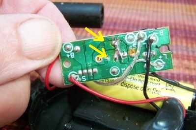 Las dos flechas amarillas indican los rastros de circuito normalmente en puente con el interruptor. Me la pelaron unos 1/2 pulgada en el extremo de algunos alambre de cobre de calibre pequeño del tamaño de cable de altavoz. Había estañado con soldadura. Entonces yo había soldado al final un rastro. A continuación había soldado el alambre estañado para el punto de contacto en el otro rastro. Entonces recorta el alambre tan sólo la derivación seguía siendo. Puedes ver mi desviación a la derecha de las puntas de las flechas amarillas.