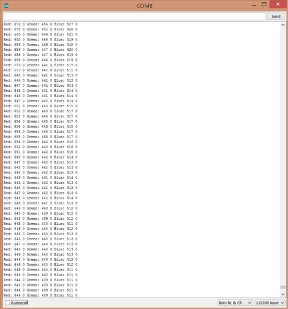 Añadir el código para el Arduino y abra al monitor de serie con una velocidad en baudios de 115200. Debería ver el monitor escupir líneas como: rojo: 746 0 verde: 493 0 azul: 572 0. El primer número después de que el color es el recuento de la frecuencia.