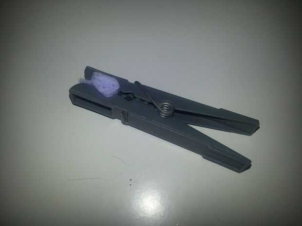 Ahora tienes que doblar el pedazo algunas veces y ponerlo en la pinza para la ropa. (Podría ser necesario ajustar las dimensiones exactas de la parte. Pero de donde provenía el primer pedazo, habrá más...)