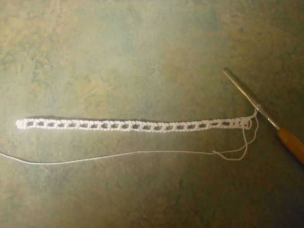 Fila 1: C.c. en 4 de cadena desde el gancho, dc en las próximos 2 cadenas (este es el comienzo del borde sólido a lo largo de la parte superior). * Cadena 2 y CC en los 3 cadena (o en otras palabras, skip 2 cadenas), repetir desde * hasta que tenga 19 espacios de la red abierta, dc en los últimos 4 puntos, (el borde sólido a lo largo de la parte inferior) cadena 3 y gire.