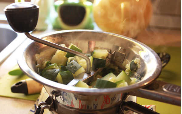 Pasa los calabacines a través de un molino de alimentos con el disco con los agujeros pequeños para obtener una salsa fina con pequeños trozos de calabacín dentro. Puede usar una licuadora si usted no es dueño de un molino de alimentos, pero en este caso obtienes una salsa muy espesa y se debe diluir con un poco de caldo de verduras o agua para cocinar el pescado en ella.