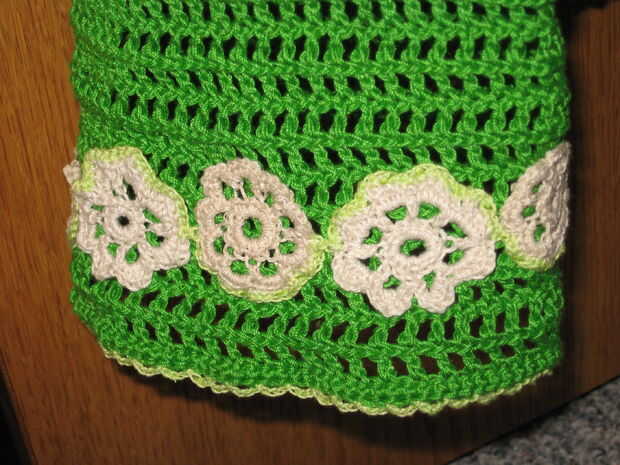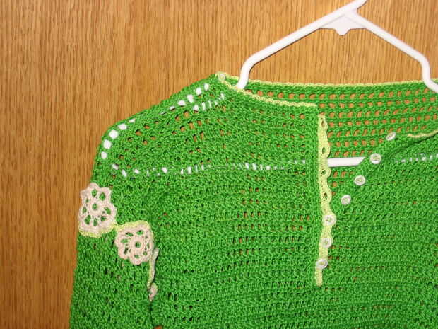 esto es una chaqueta que he hecho de un antiguo modelo de los años 70. Encontré "De McCall del ganchillo del tesoro" en una tienda de libros usados, y este es un patrón de este libro (p.50). Utilicé dos filamentos de abrigos y ganchillo de Clark de la pisada en verde y un 2, 5-3, 00mm ganchillo gancho.